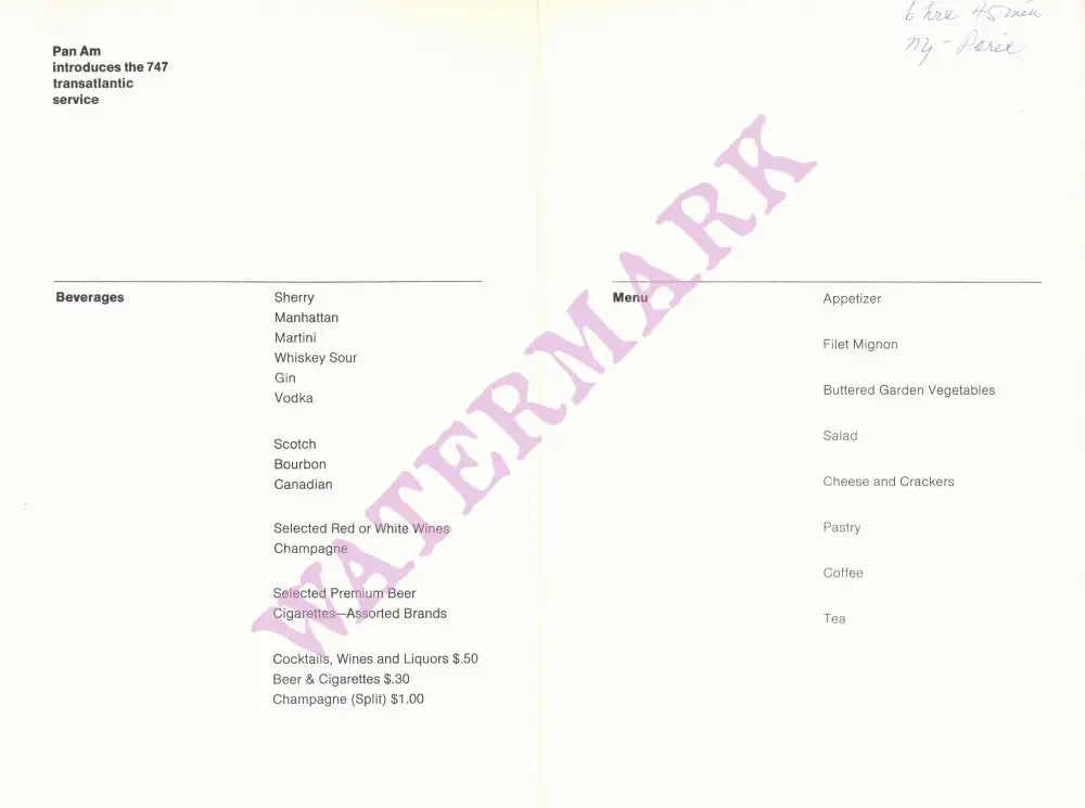 This inflight menu cover was for a trip from New York to Paris and the passenger noted that the flying time was six hours and 45 minutes.