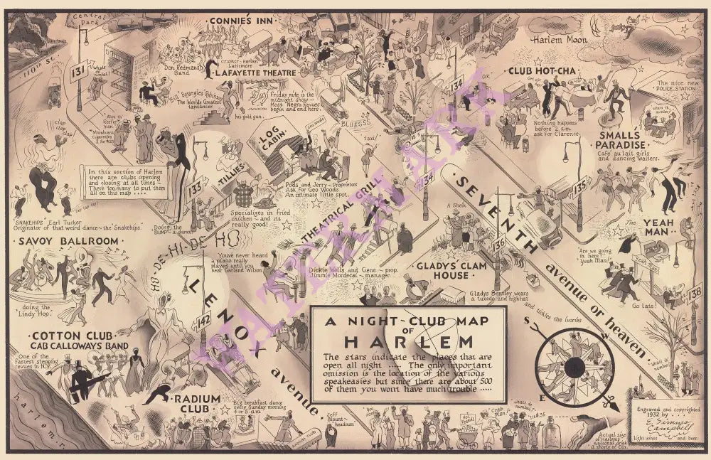 The map illustrates a wide range of Harlem hotspots popular in the 1920s and ‘30s and depicts the Cotton Club, Small’s Paradise, the Savoy Ballroom, the Radium Room, Lafayette Theatre, Club Hot-Cha, the Log Cabin, Connie’s Inn and the Theatrical Grill.