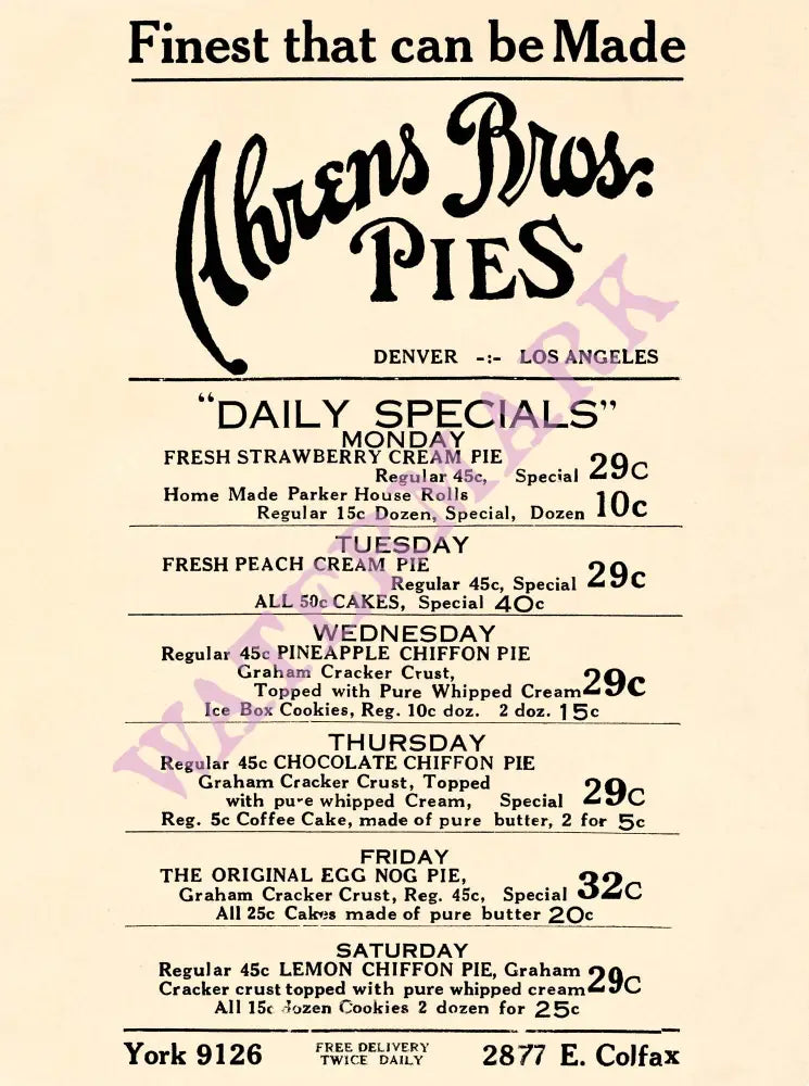 Ahrens Bros. Pies, Denver & Los Angeles 1930s