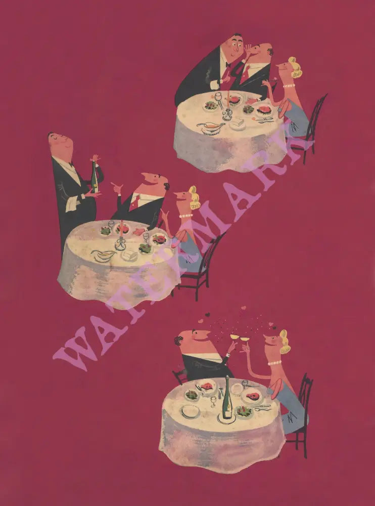 There are fantastic expressions on the faces of the happy couple and the waiter in this menu cover from Al Reiner's Prime Rib, a restaurant in Philadelphia. Booze was obviously one of the draws, with giant-sized cocktails offered as "mammoth potions."