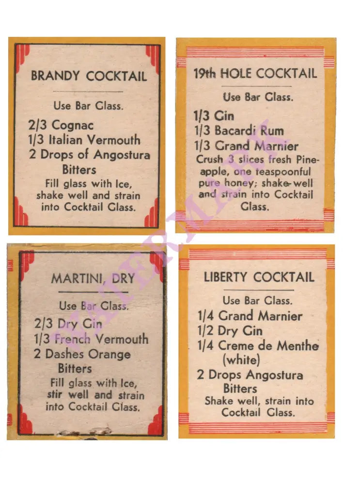 After the repeal of Prohibition in 1933, when it was possible to drink alcohol in public, there was huge interest in cocktails. Recipes for the perfect drink were often given to tempt people into bars or to buy booze to make cocktails at home.