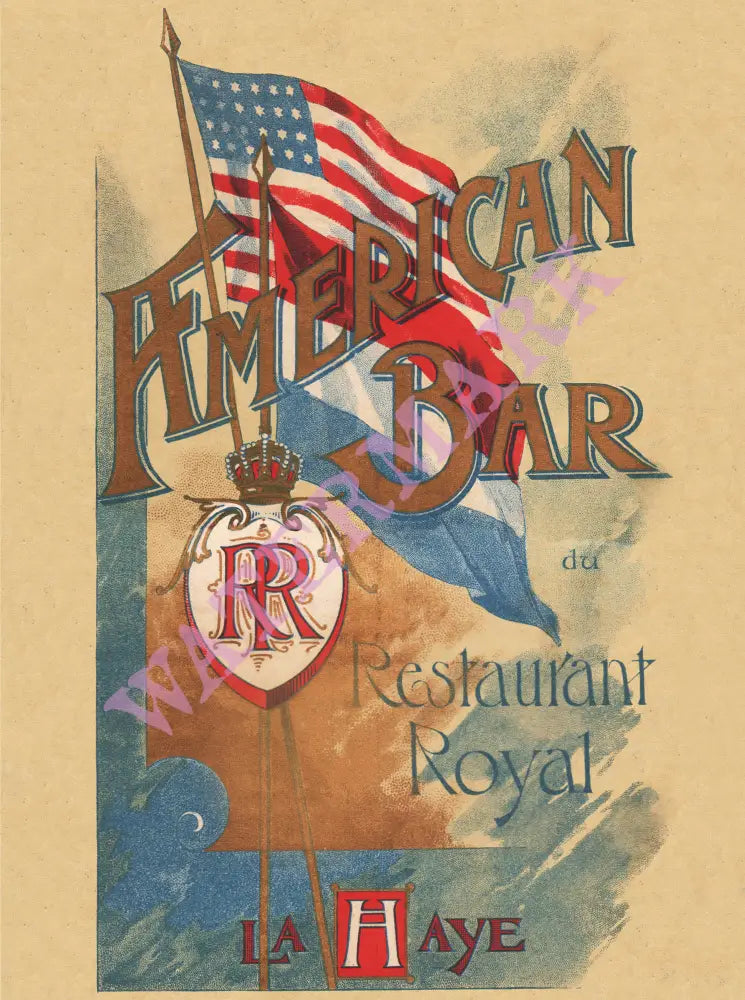 This impressive and patriotic menu cover featuring American and Dutch flags was printed for the Restaurant Royal, a grand establishment in The Hague, the administrative capital of The Netherlands.