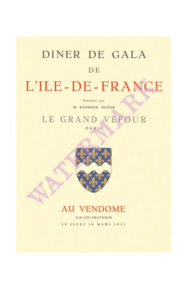 This elegant menu is for a dinner that was held to honor L’Ile-De France, which is now one of France’s wealthiest regions and is located in the greater Paris metropolitan area. We’re not sure why this region was celebrated at a dinner held at Au Vendome, which was located in the south of France. We do know that this meal was prepared and presented by one of Paris’ great chefs of the day, Raymond Oliver, of Le Grand Véfour, one of the most celebrated restaurants in Paris.