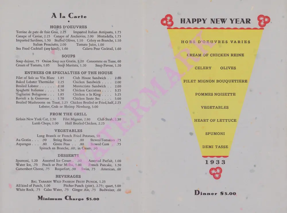 This menu, on textured paper, features a stylish woman and a jester about to celebrate the New Year of 1933.