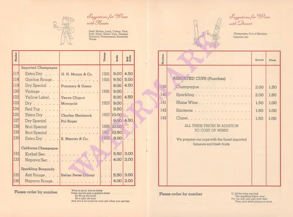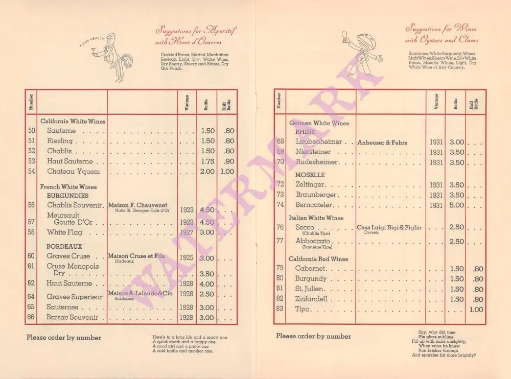 Green Devil and Havana Punch cocktails were available for 50c as well as German, French. Italian and California wines and multiple vintages of 1920s champagnes, which had been carefully hoarded. the interior menu also featured poems about wine and other caricatures.