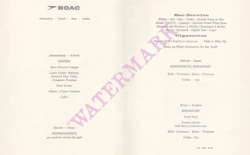 British Overseas Airways Corporation was the British state-owned airline created in 1940 by the merger of Imperial Airways and British Airways Ltd. Six or seven course lunches and dinners were served to passengers in First Class. Complimentary cigarettes were offered after take-off and after meals.