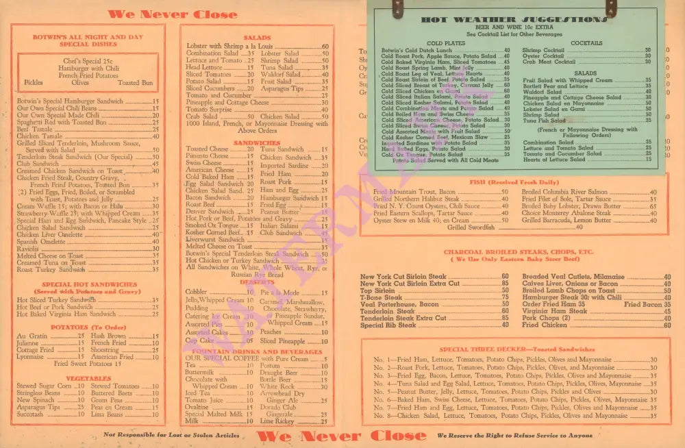 Steaks, seafood and cocktails were on the all-day all-night food list and there was a Sierra Room, which we assume was for large, catered parties. The restaurant had two telephone numbers EXPOSITION-0309 and DUnkirk 9-0309.