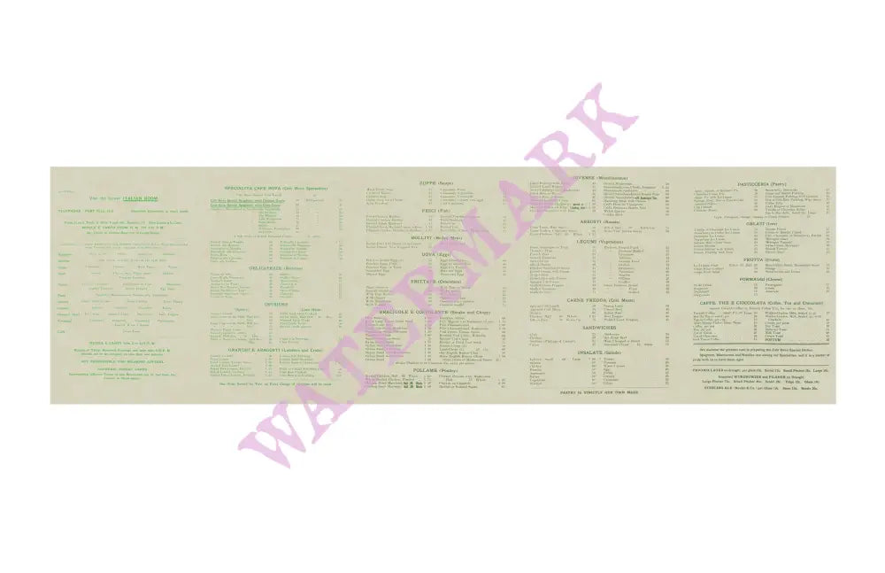 This colorful menu cover dated circa 1906 represents a truly ethnic, period Italian restaurant in Boston, with every menu category written in Italian. Food was served at Bova’s at any time of the day and a ten-course dinner including wine was 75 cents.  The restaurant was opened by Antonio Bova, who came to America from Calabria, and his descendants still run one of the North End’s most famous bakeries..