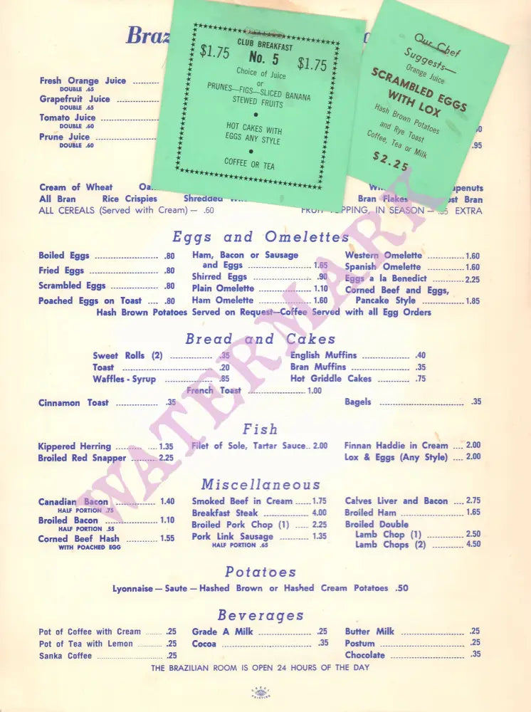 This colorful and highly stylized menu for the Brazilian Room, which was open24 hours a day, is from the 1970s and features the breakfast menu.