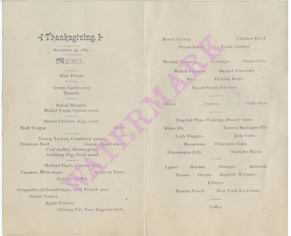 In the 19th century, some menu illustrations had a morbid/ mischievous sense of humor. This 1883 menu cover from the Briggs House Hotel in Chicago shows rabbits, chickens, a duck, a turtle and a frog dancing around a pot, unaware that they would shortly be inside that pot as the ingredients for a Thanksgiving dinner.