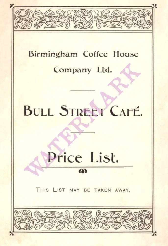 An early menu from the Birmingham Coffee House Company Ltd in England’s second city. By 1917 coffee houses were booming in England. The Bull Street Café, a Quaker-owned establishment (like another Birmingham based company - Cadbury's) was part of the Temperance movement and hoped to provide alternatives to pubs. The Birmingham Coffee House Company was founded 1877. They also opened the Cobden Hotel on Corporation Street, where House Of Fraser (formerly Rackhams) is now.