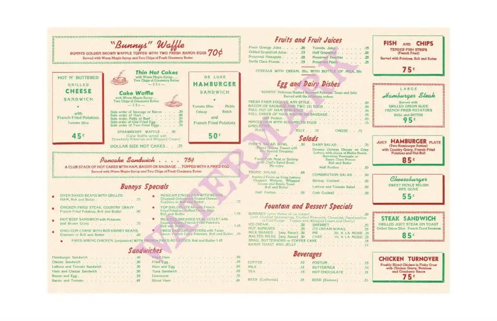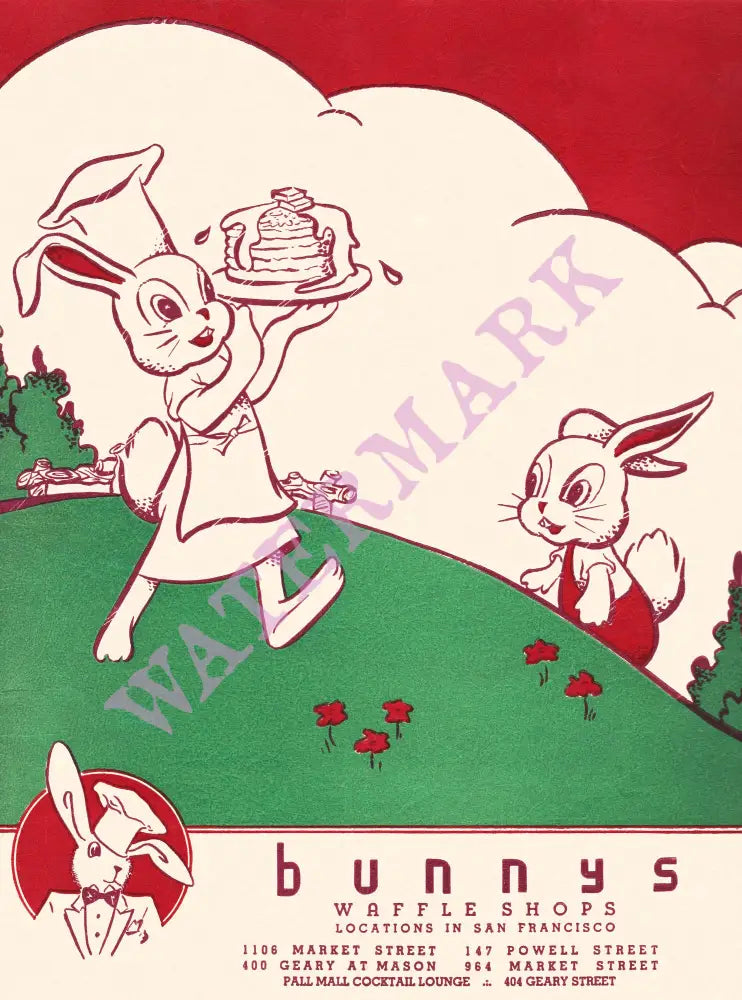 Bunny's Waffle Shops were owned by William J. Barbash and W. Joseph Bulasky (of Reno) and operated from 1931 -1968 in San Francisco and Reno. The "suave" bunny (bottom left) was used on tableware and matchbook covers.