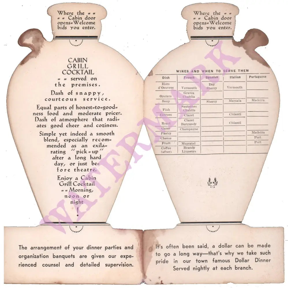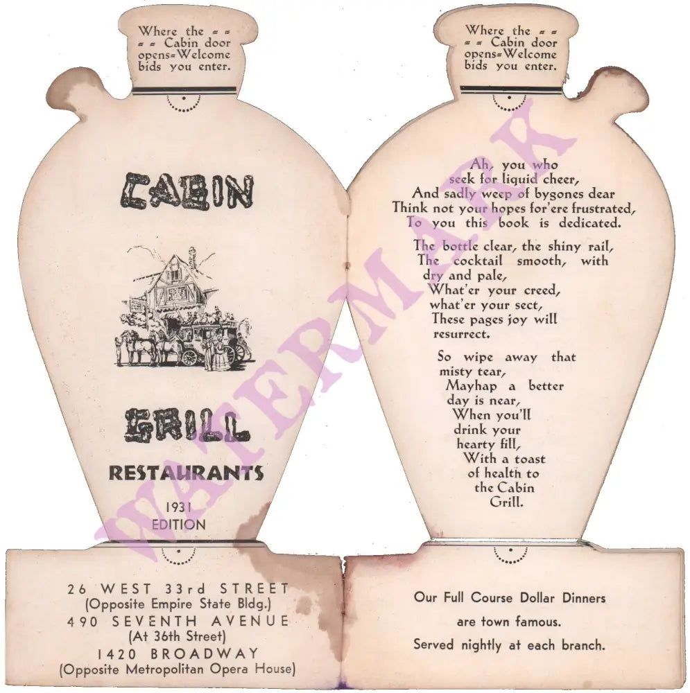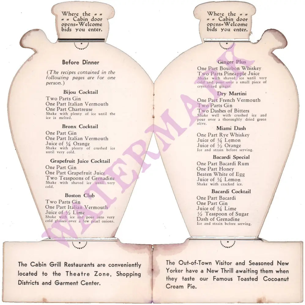 Waiter – bring me a very large cocktail. This promotional brochure for the Cabin Grill in New York City dates to about 1935 and is a nostalgic look back at the naughty days of Prohibition. A witty poem: Ah, you who seek for liquid cheer and sadly weep for bygones dear…expresses the frustration of those who couldn’t get a legal drink during the era that outlawed the sale and production of alcohol. There are ‘receipts’ – the term used at the time for recipes – for proper cocktails since drinking was now about something more than just getting drunk on cheap booze.
