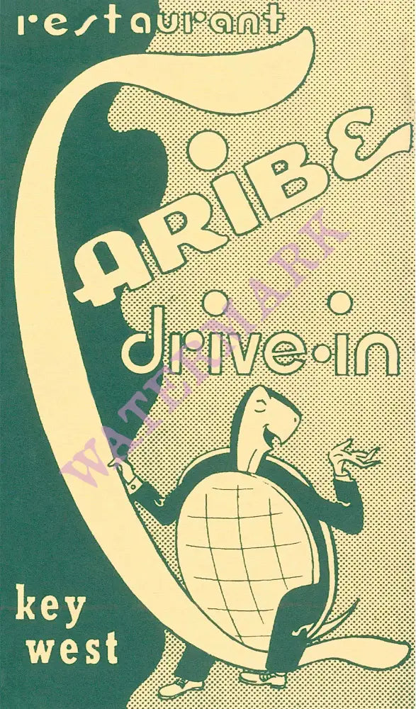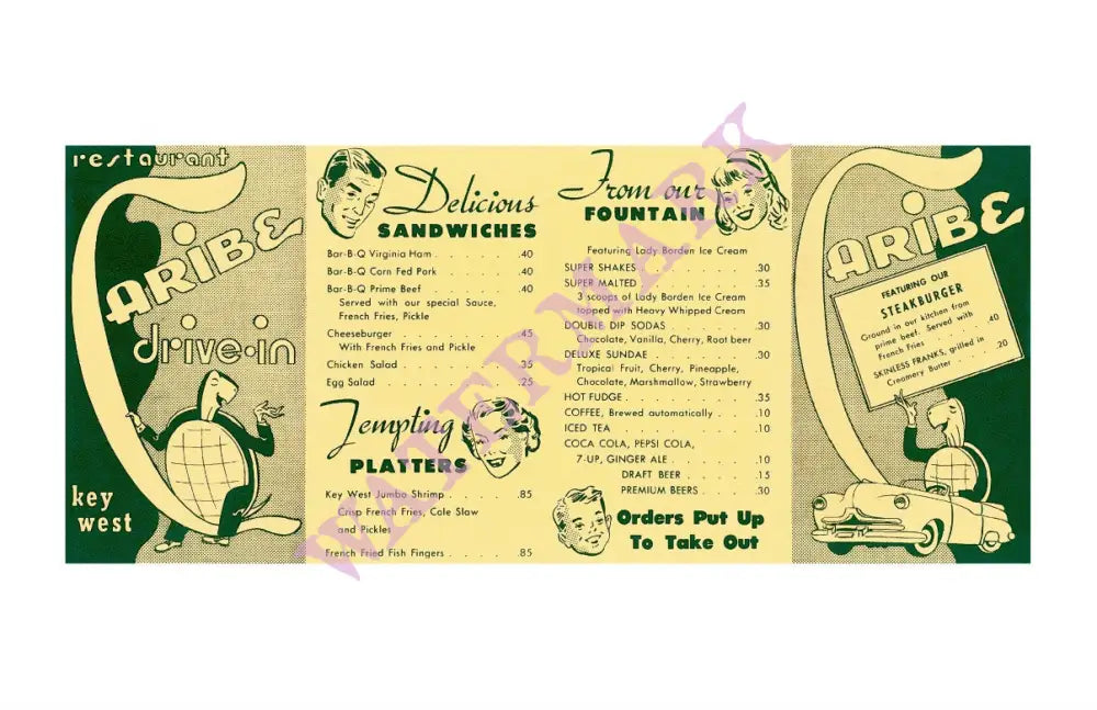 We love this happy turtle – who is wearing shoes and what looks like a suit underneath his shell – on the cover of the Caribe drive-in in Florida’s Key West. With great graphics and illustrations, this vintage menu print is a lovely reminder of the glorious era of drive-ins where there were car hops and curb service. This menu is undated but we think from the prices on the interior that it is probably from the 1950s.
