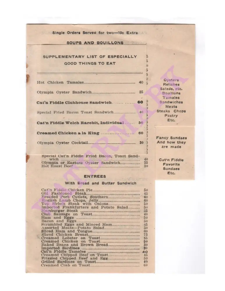 The Cat ‘N Fiddle was a beloved Portland restaurant. Notable Portland social gatherings took place at this establishment according to local newspapers from the era of 1915 - 1923; in each instance it is referred to as the Cat ‘N Fiddle Confectionery & Tea Room.