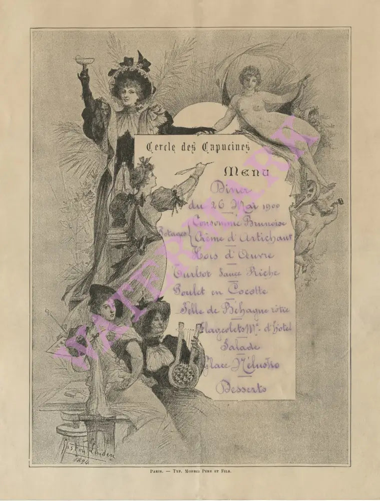An 1894 pencil and charcoal drawing by renowned artist Gaston Linden surrounds the set menu for 26 May 1900 at the Cercle (Club) des Capucines, probably above the legendary restaurant, established in 1875, Le Grand Café Capucines. The restaurant (which never sleeps) is still in operation today.