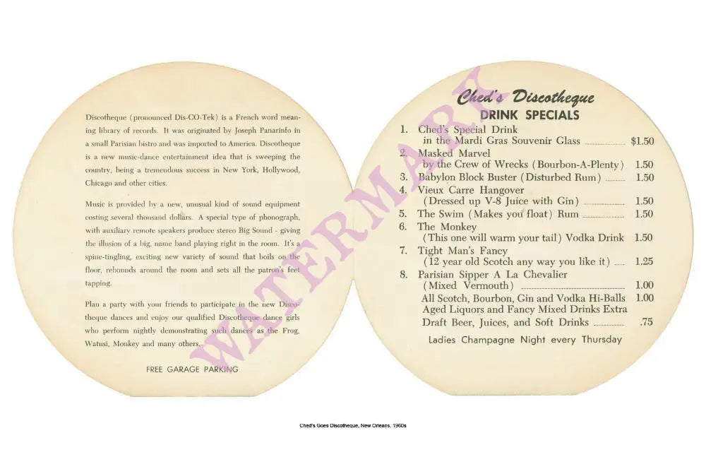 Go-go dancers performed The Frog, The Watusi and The Monkey on stage at Ched's Lounge in New Orleans in the Sixties. This striking menu cover announced that the bar was featuring a new type of entertainment called "Discothèque." You can read the full explanation on the interior menu but Ched's was way ahead of the curve since disco really only became popular in the Seventies Billboard magazine, reporting on the new music phenomenon in 1965 in an article entitled Discotheque: How is the Go-Go Going?, paid a visit to Ched's. The magazine said the go-go girls at Ched's were "WILD!"