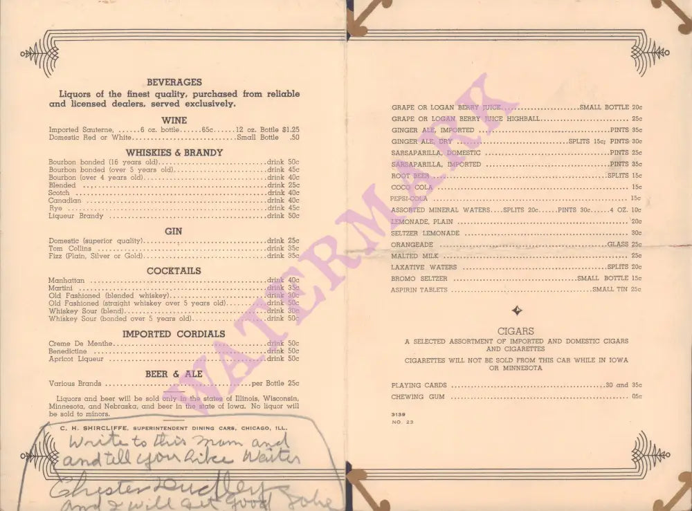 This marvelous beverage menu from the 1930s illustrates how passengers drank very well in the dining car. They could choose cocktails, beer, wine, whiskeys, brandies, gin fizzes and soft drinks ranging from coco cola (sic), sarsaparilla and, bizarrely, laxative waters.