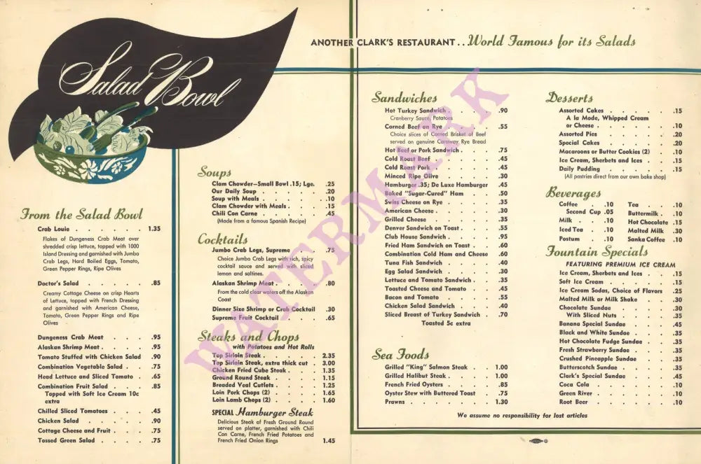 Clark's Round the Clock Cafe was located at 1001 Olive Way in Seattle. Round the Clock was one of 53 restaurants in Walter Clark's Seattle restaurant chain. He opened his first restaurant in 1930. "Clark was noted for serving good food at an affordable price. In the 1940s, he stuck with 5-cent coffee long after many competitors raised the price. He put on a $1.50 Thanksgiving dinner in 1942 and had customers standing in line. ``We didn't make much money on each customer, but we sure had a lot of customers,'' Clark once recalled." (Seattle New Times) He was widely regarded as the "father of the Seattle restaurant industry and ultimately sold the chain to the Campbell Soup Company in 1970 for an estimated $4.9 million. His favorite establishment, The Red Carpet, was included in the purchase. But, as Clark said later, "they sent a bunch of soup men to run the restaurant and they didn't do a very good job." Walter Clark died in 1990 at the age of 93.