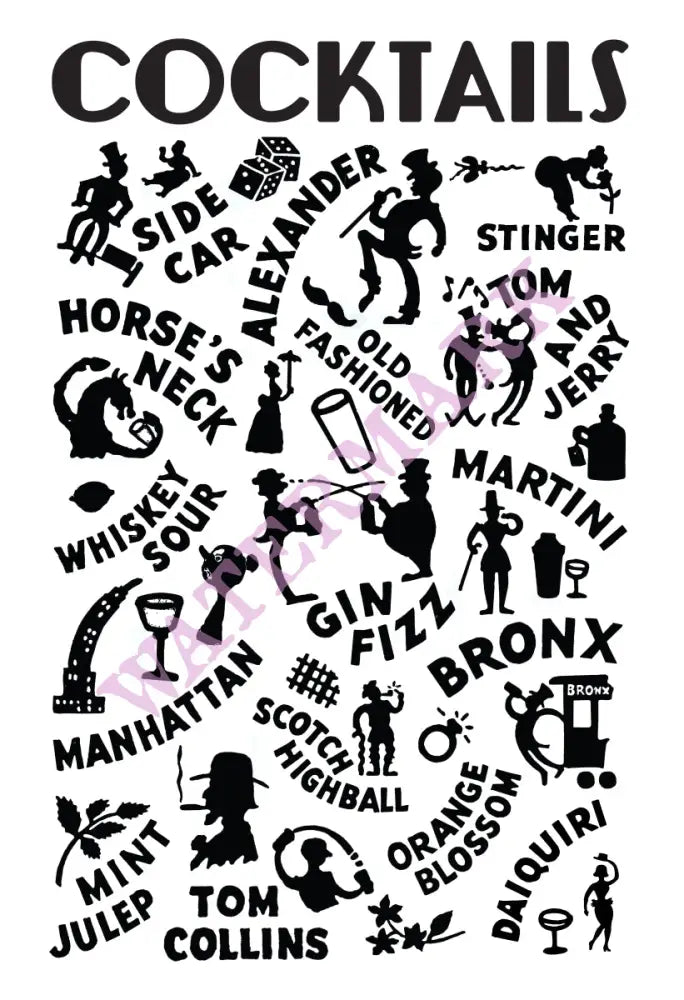 These cocktail images were created shortly after the repeal of Prohibition in December 1933 in the state of New York, hence their celebratory air. Everyone is a little tipsy, including Manhattan’s newest skyscraper, the Empire State Building, which had been completed in 1931. The drawings come from a drinks menu from the Hotel Manteo in Cold Spring, New York and are a fine example of imaginative vintage menu artwork. The McCaffrey family ran this establishment from the early 1900s until 1978.