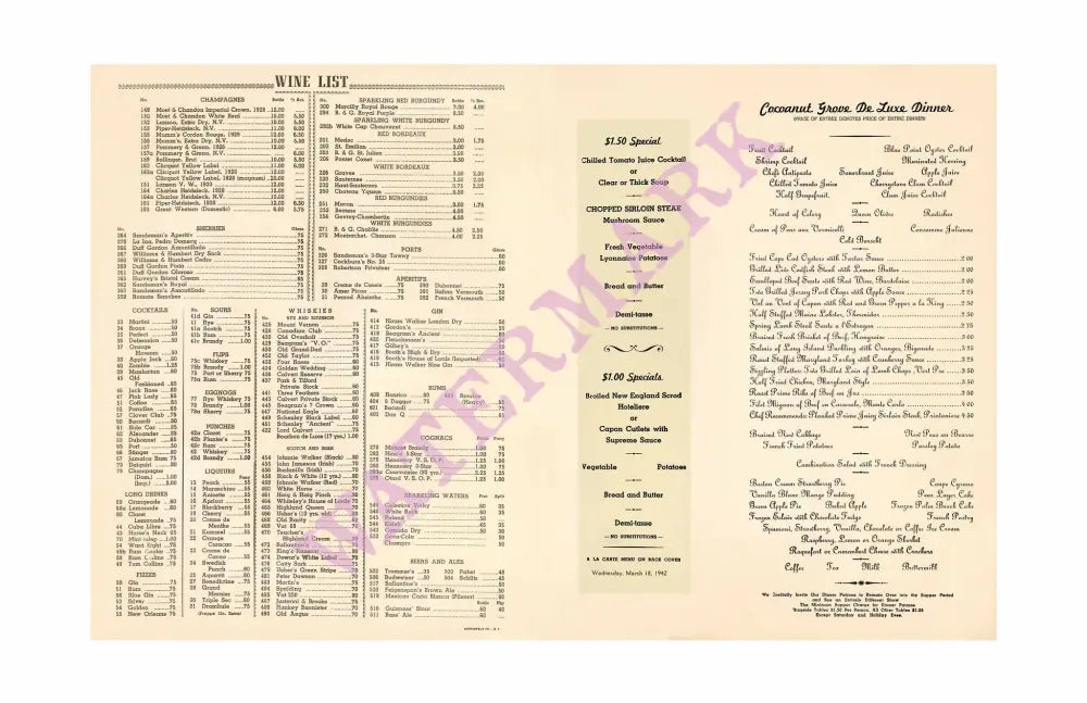 There’s a whole lot going on in this marvelous vintage menu print from the Cocoanut Grove nightclub at the Park Central Hotel in New York. The jazz singer Ella Fitzgerald sang here regularly with the Chick Webb orchestra. The cover charge to drink, dine and dance was 75c on weekdays and $1.50 at weekends. The menu is dated 1942 and this Cocoanut Grove was probably modeled on the original nightclub in Los Angeles
