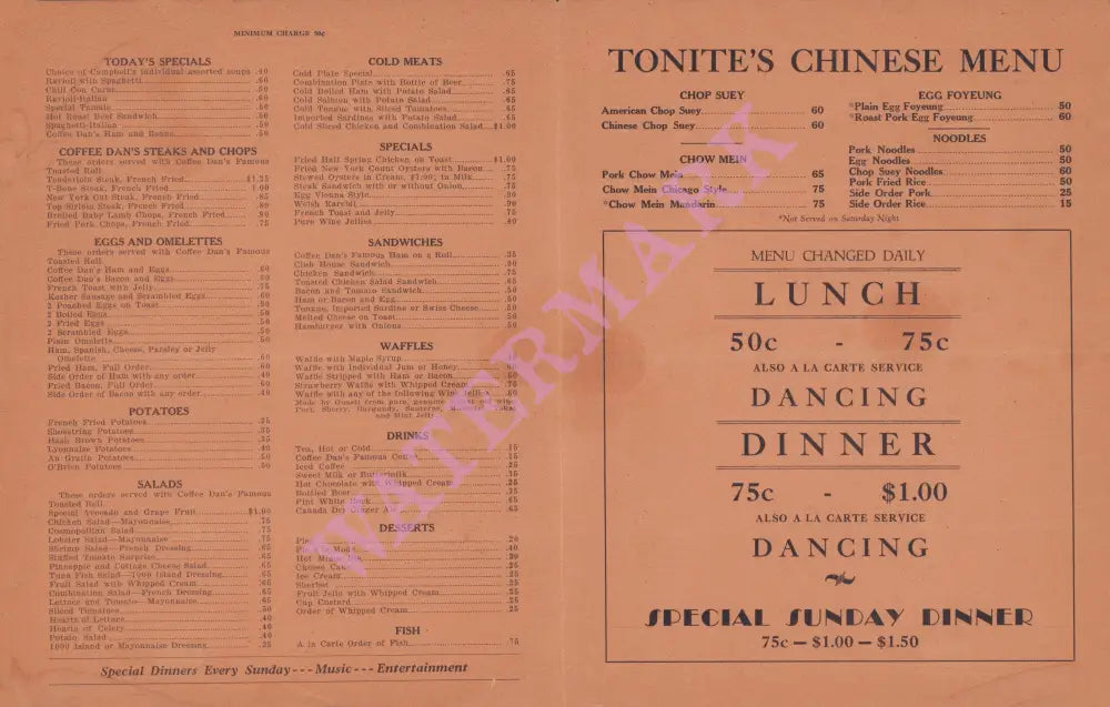 Coffee Dan’s served American and Chinese food and you will notice that the only drinks on offer on the menu ranged from tea to ginger ale. Alcohol would have been served ‘under the table’ or patrons would bring their own.