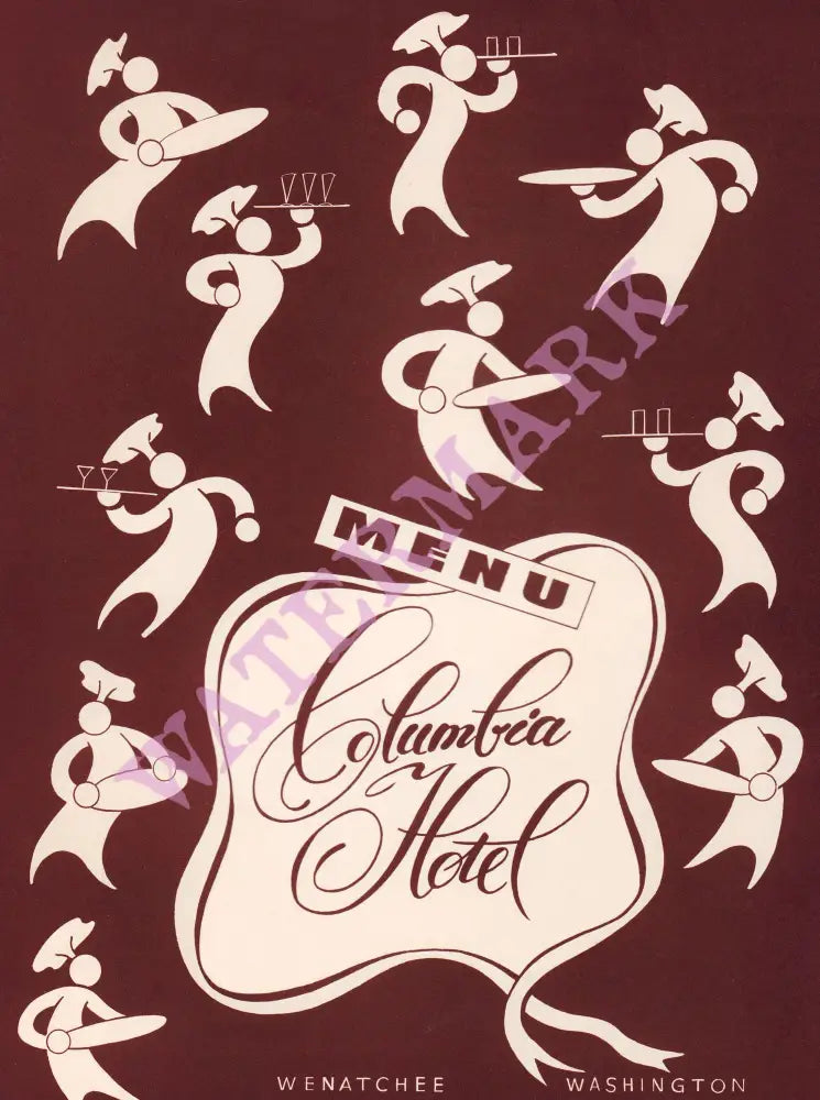 This 1954 menu shows little chefs serving drinks or carrying trays and was the front cover of a menu from the Columbia Hotel in Wenatchee, Washington, sometimes called the Apple Capital of the World thanks to the valley’s many orchards.