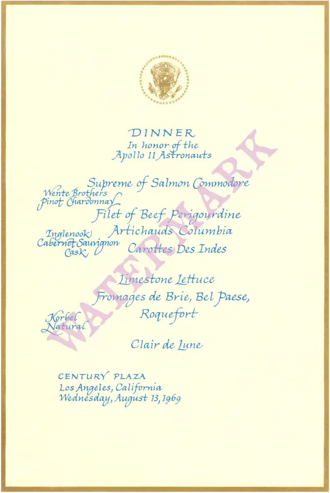 On August 13, less than a month after Neil Armstrong and Buzz Aldrin made the historic first landing on the moon in 1969, they and fellow astronaut Michael Collins were guests at this dinner given in their honor in Los Angeles. The trio was on a triumphant tour of the United States and had already been feted by hundreds of thousands of people in tickertape parades in New York and Chicago.