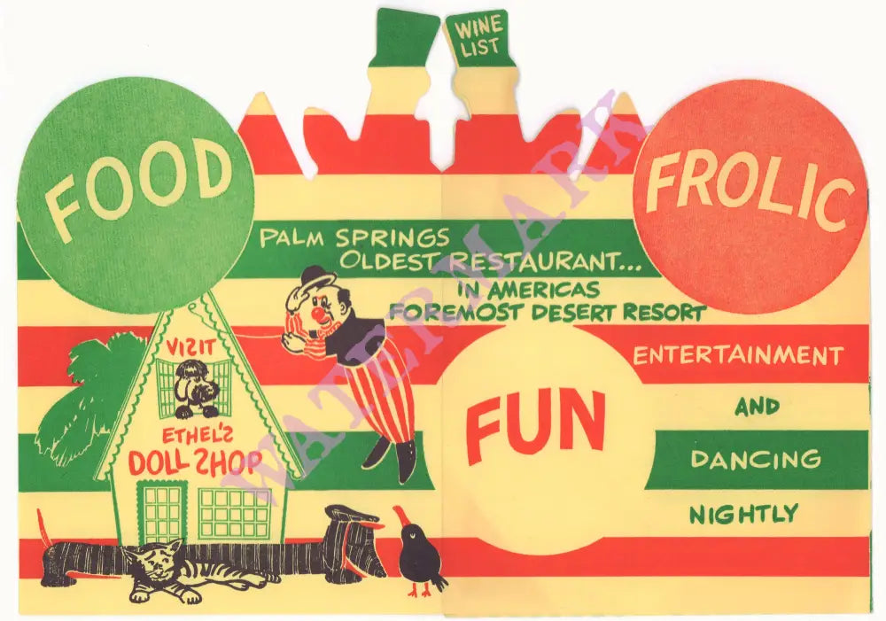 In the 1960s Ethel and her husband John sold the site of the Doll House – it was a one-story roadside building at 1032 North Palm Canyon Drive – to a steakhouse owner and opened another place called Hideaway. Then they opened That John’s. A new Hideaway was opened at the then brand-new Smoke Tree Village shopping center and Ethel's stellar career as a restaurateur continued till her retirement.