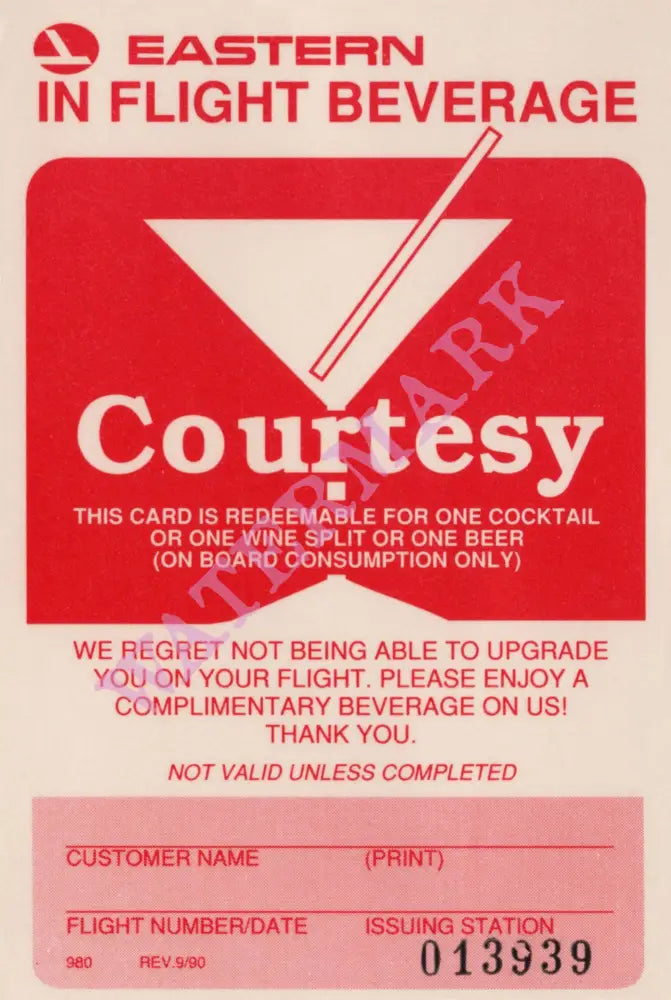 Eastern Airlines Courtesy Beverage Card, 1990