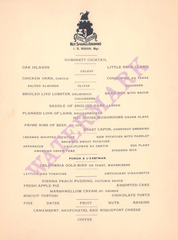 This menu was for the opening dinner of the 1910 season which would run till June when the hotel would close. The Eastman was eventually demolished in 1946.