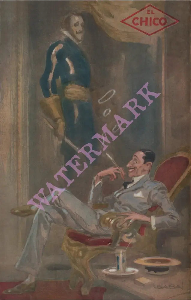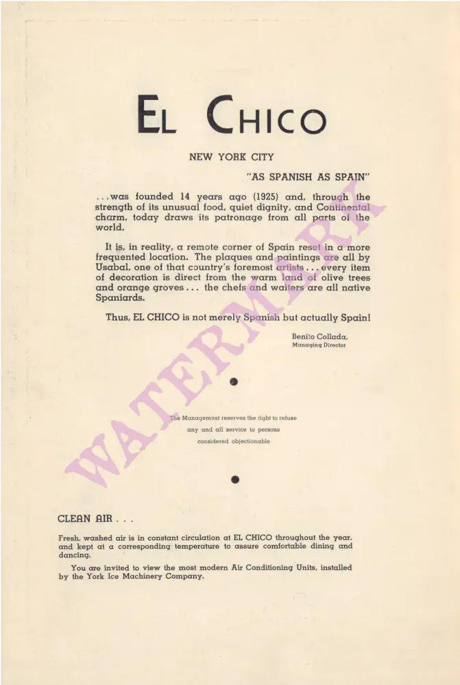"El Chico" was a Spanish restaurant located in the West Village at 80 Grove Street in New York. Describing itself as "New York's most Spanish Restaurant - As Spanish as Spain". The menu cover art is a painting by Luiz Usabal y Hernandez (1876-1937) a Spanish painter and illustrator famous for his postcard and film poster work. El Chico's walls were decorated in colorful murals depicting scenes from Spanish life and they are still on the walls, now behind plexiglas, of long-time club The Monster.