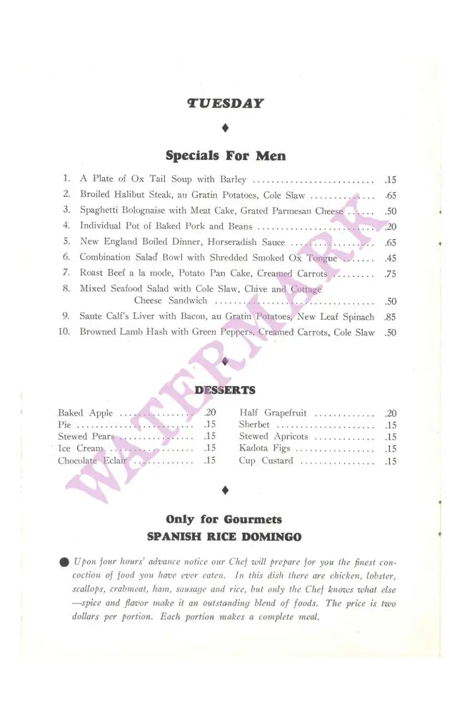 The Esquire's menu was geared towards hearty he-man tastes such as Spaghetti Bolognaise (sic) with Meatcake and Spanish Rice Domingo which featured "chicken, lobster, scallops, crabmeat, ham, sausage and rice."
