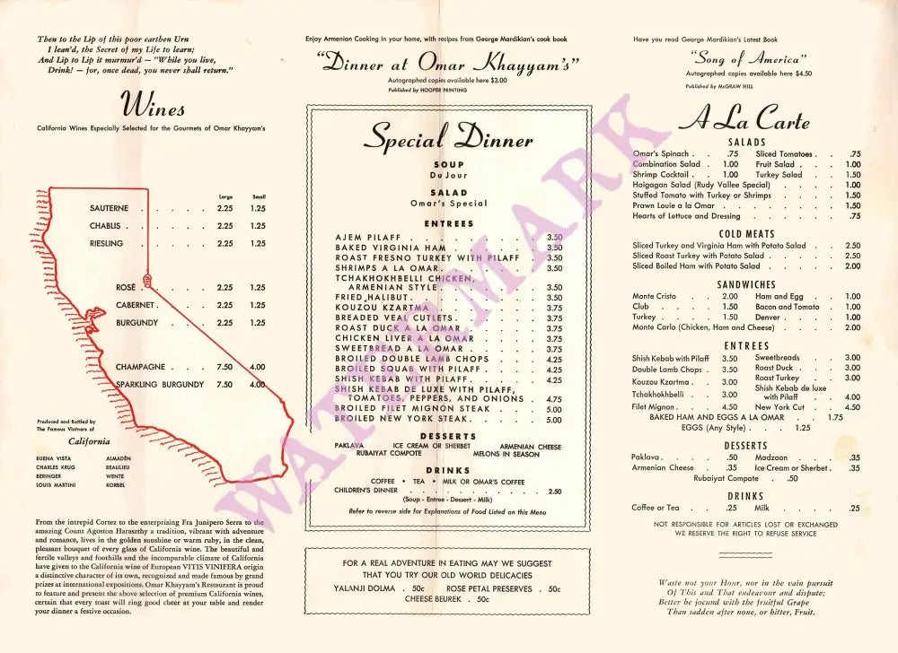 The menu at Omar Khayyam’s heavily featured Armenian dishes – this would have been a novelty at the time.
