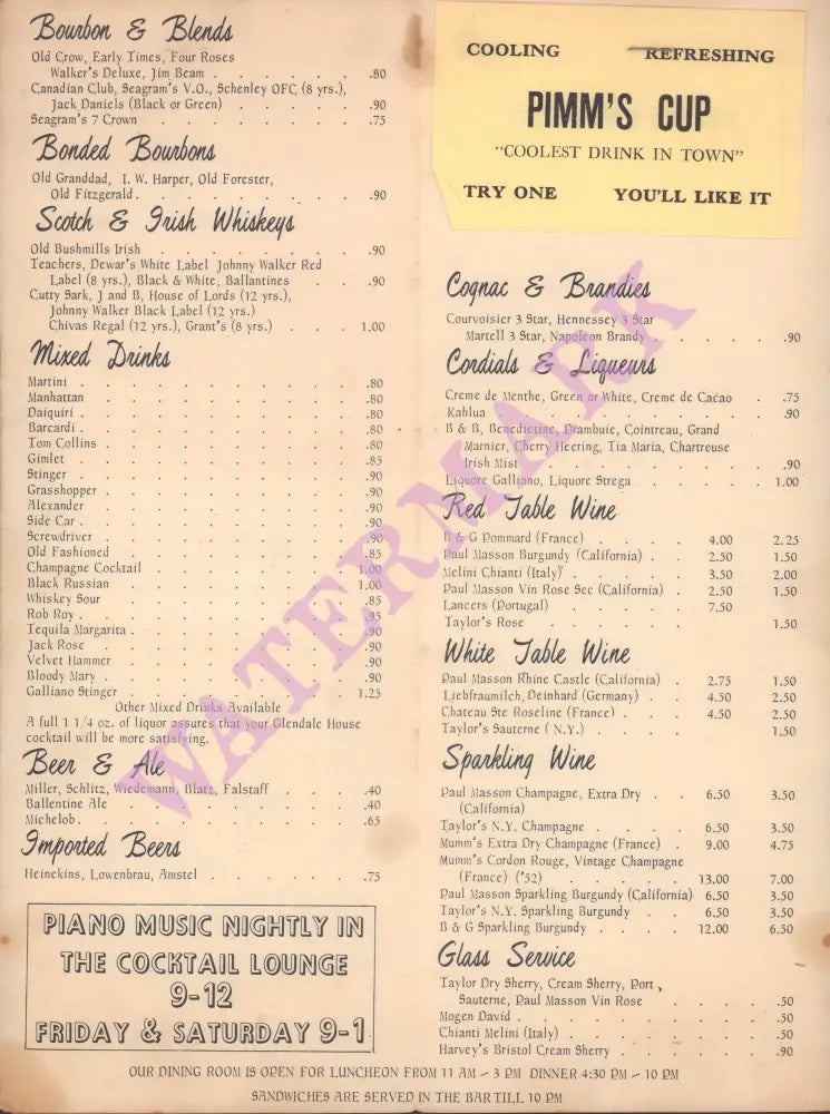There was piano music nightly in Glendale House’s cocktail lounge where happy imbibers must have appreciated the design qualities of this menu. Formal dining took place in the restaurant while a patio café in the mall was set aside for informal family dining. The business was bought out in the 1970s.