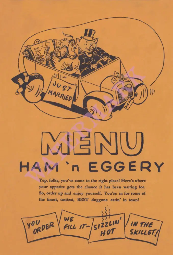 The artwork shows a just-married pig and hen driving off to their new life – the interior menu shows images from their ‘marriage” including a fight and a stroller full of their offspring.