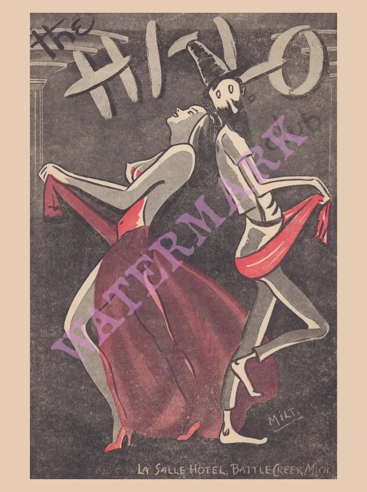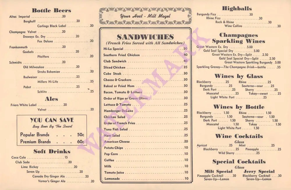 The ultra-modern nightclub (for its time) was run by Milt Magel, who also created this remarkable menu cover. It shows a scantily-dressed woman – presumably the Hi in Hi-Lo – dancing with a pipe-smoking hillbilly - presumably the Lo.