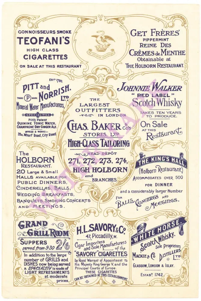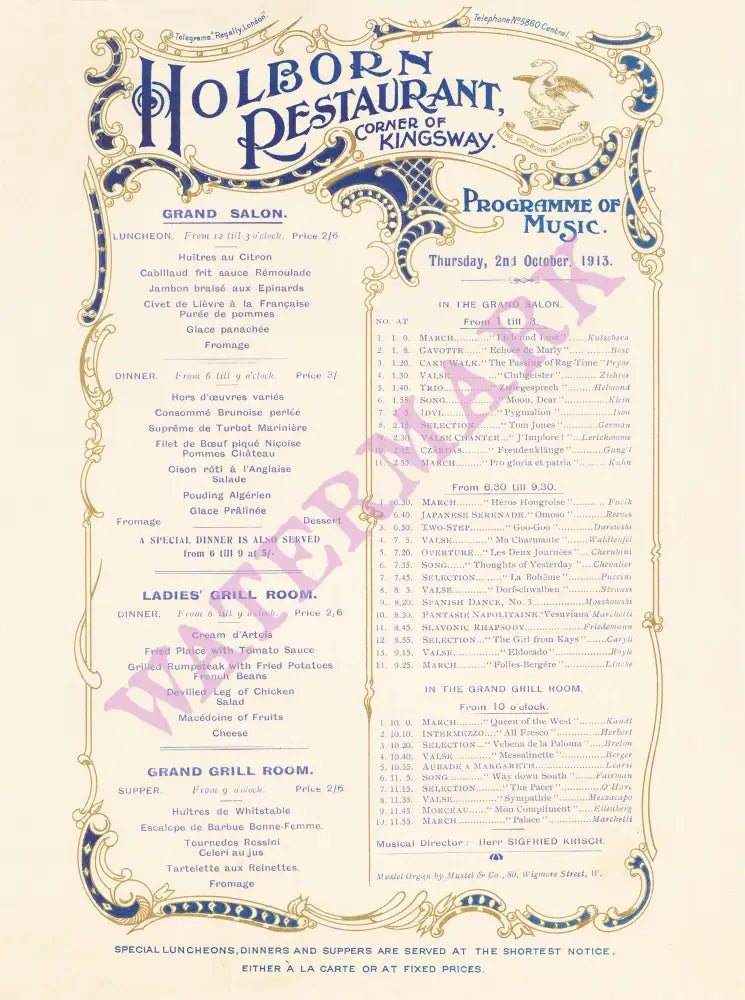 The Holborn was a very grand restaurant in London, much favoured by “high society” in the early 20th century. The main dining room was the Grand Salon where lunch and dinner was served by waiters in formal dress. There was a smaller Grill Room and ladies could dine with their friends in a separate area. Music played by the in-house orchestra provided the entertainment and there was much smoking and drinking.