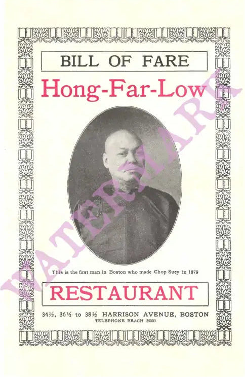 Established in 1879, Hong Far Low was one of the first Chinese restaurants in the United States. This menu figures prominently in Wing Kai To's important history book, "Chinese in Boston: 1870-1965". A whole fried lobster cost $1 in the 1930s and a boneless chicken cost ten cents more.