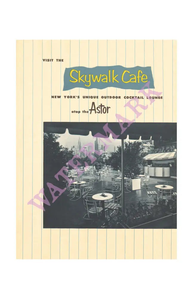 Built in 1904, the Astor Hotel had elaborately decorated public rooms and a beautiful rooftop garden with a bandstand and an observatory. Situated in New York’s Times Square, it was a popular pre-theatre meeting place and the restaurant thoughtfully provided the curtains-up time for all the plays that were on Broadway, including South Pacific, Dial M for Murder and The Seven Year Itch. This 1953 menu cover is similar in style to other menus created for hotels such as the Hotel Roosevelt in New Orleans, adapted by the artist for each individual property.
