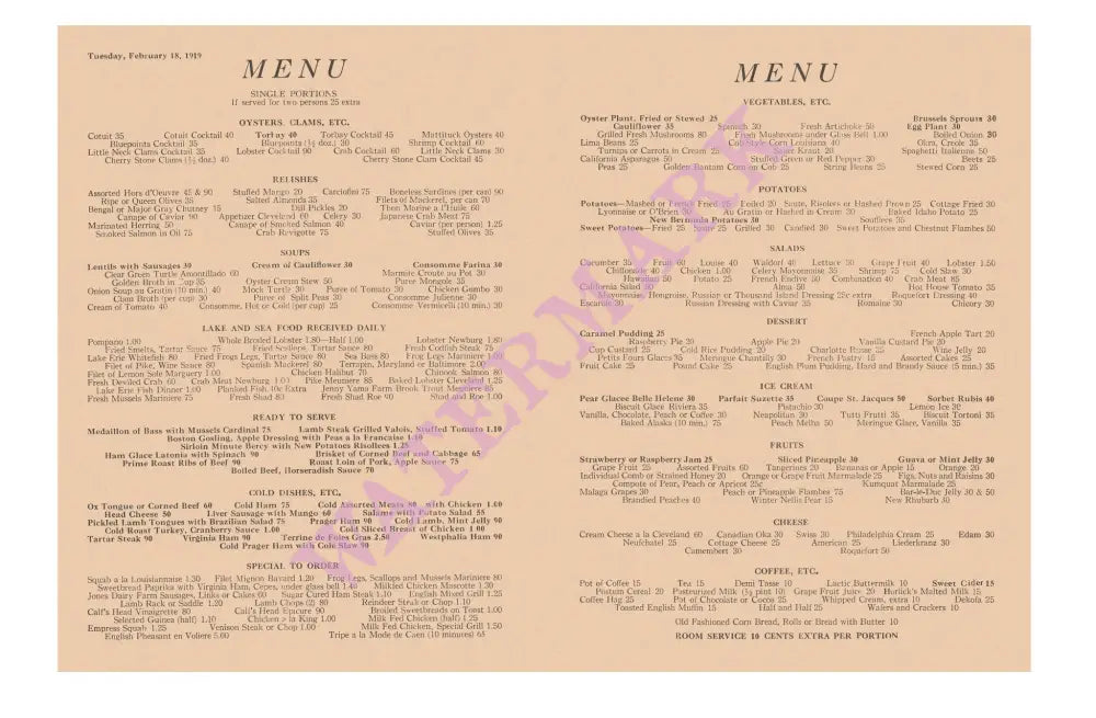 Hotel Cleveland: This 1,000 room hotel was built in 1918 by the Van Sweringen brothers as part of an attempt to revitalize the city’s Public Square area. The delicate menu cover is lovely and has an art nouveau ring to it but it is the interior of this 1919 menu that fascinates. It has 267 items on offer including 14 clams and oysters dishes, main courses that included frogs legs and terrapin as well as beef and lamb,18 types of potato and 16 desserts and 18 ice-creams. Like many hotels, it has been bought and sold numerous times and is now in the hands of the Renaissance Group.