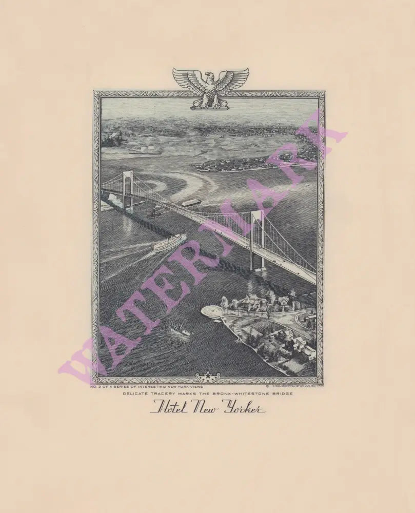 One of five iconic New York views celebrating four bridges (George Washington Bridge, Bronx Whitestone Bridge, Tri Boro Bridge and the Brooklyn Bridge) and the recently completed La Guardia Airport that the Hotel New Yorker produced as menu covers in 1941. The engraving was done by Dr. Joseph Guttman. Dr Joseph Guttman founded the Steelograph engraving company. came to the United States from Europe and created the company in the 1920s. Steelograph specialized in steel engraving, an intaglio process in which the design is cut into a hard steel plate that yields sharp impressions even in large editions.