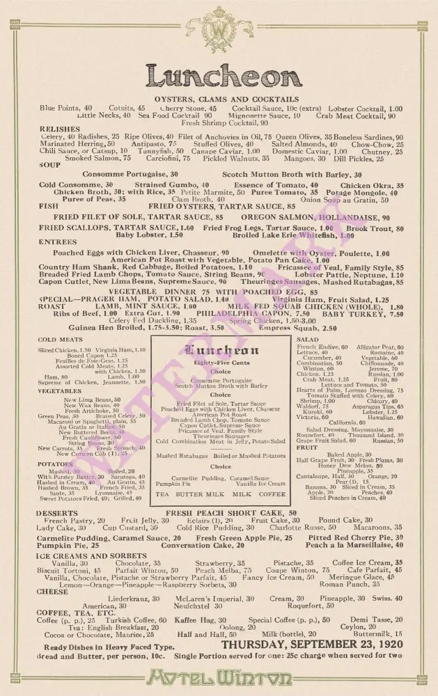 The Hotel Cleveland, built in 1917, offered private baths, grand public rooms, and luncheon in its dining room. The menu was a prime example of traditional dining choices of the day. The selections were plentiful and could please any palette. The prix fix luncheon special for 85 cents was a deal! Shortly after this menu was put in place, the hotel’s kitchen was helmed by 24 year old chef Hector Boiardi. He served wildly popular spaghetti dinners and later changed his name to Chef Boyardee. The rest is history. He mass produced tomato sauce for millions of Americans who were ready to prepare an authentic Italian meal at home.