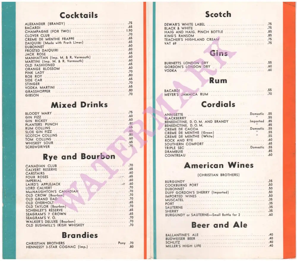 Howard Johnson's Liquors USA 1960s Menu Art
