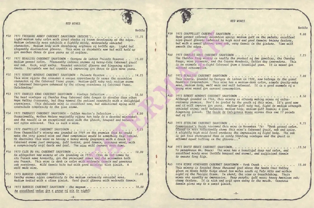 The blurb on this wine list references the Judgement of Paris and says: ‘California wines will someday rival the great French Chateaus. This is no idle statement. It was done recently and will be done again.’