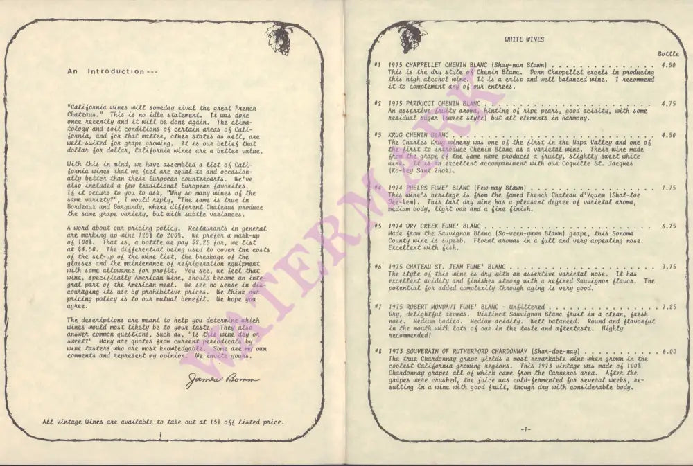 It went on to say that since wine, especially American wine, should become an integral part of the American meal, prices were not prohibitive for those unused to drinking wine. The mark-up on a bottle of wine was 100 per cent, to account for costs and make room for some profit, compared to 125 to 200 per cent mark-ups elsewhere