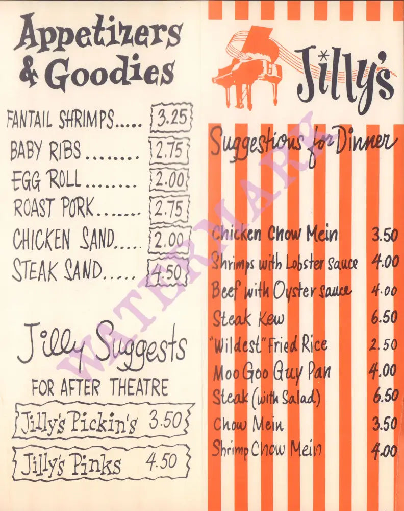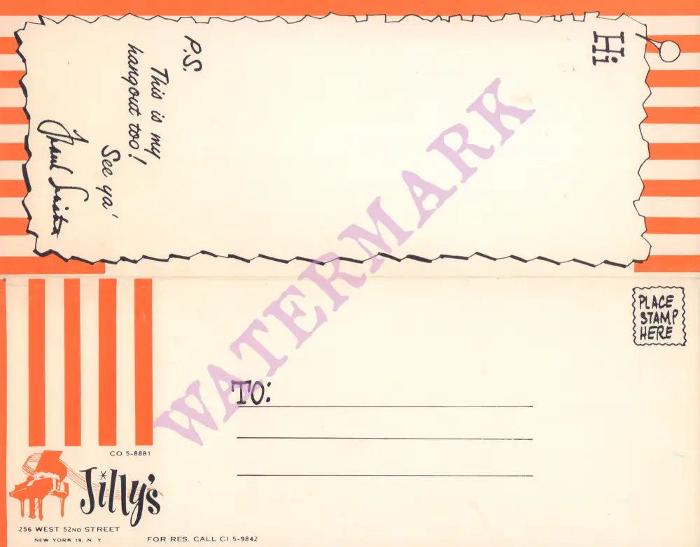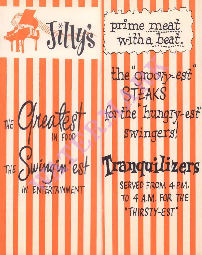 This 1960s souvenir menu from Jilly’s in orange and cream stripes perfectly captures the fun and excitement of snagging a coveted table at Jilly’s in Manhattan. Sinatra even allowed his name to be used on the menu, which could be posted to friends.