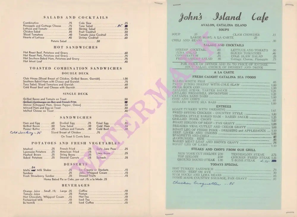 John's Café was a long-term fixture on the island, possibly dating from the 1920s when the Wrigleys started developing Catalina as a tourist destination. On the back of the menu, there’s a note that says the restaurant has been “on the ocean front for 25 years.”