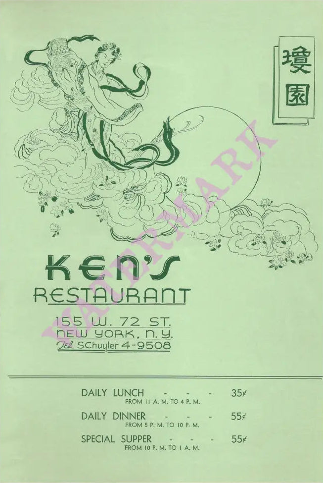 This 1942 celadon green menu proclaims its food is "Prepared the Same Way as in Canton" and also politely tells patrons, "You will do us a favor by reporting to us any inattention on the part of our employees."