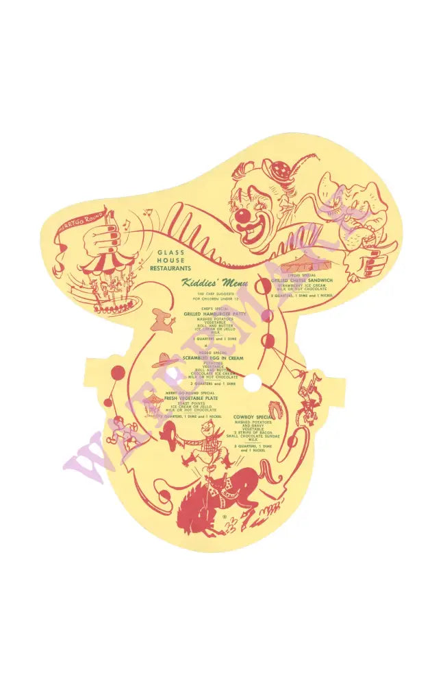This cheerful clown/chef is another example of the craze for children's menus that could be turned into masks. What's charming is that all the meals were priced in nickels, dimes and quarters so children could have an arithmetic lesson at the same time they were eating. The menu comes from the Glass House restaurant chain that was popular in the 50s and 60s.